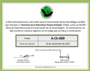 The Latin American and Caribbean Network for Bat Conservation (RELCOM), after reviewing the background information presented by the Bat Conservation Program of Chile, has certified that it recognizes the Parque Katalapi Nature Sanctuary as an AICOM (Area of Importance for Bat Conservation). The Parque Katalapi Nature Sanctuary has been registered with RELCOM under the number A-Ch-009 as of November 30, 2022. Dante Lobos Ovalle, Marcelo Mayorga, Clemente Beltrán, Juan Luis Allendes, Jocsan Herrera, Melissa Riveros, and Annia Rodríguez-San Pedro, after conducting field studies at Katalapi, submitted the proposal to RELCOM.